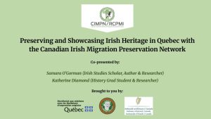 Co-presented by Samara O’Gorman (Irish Studies Scholar, Author & Researcher) and Katherine Diamond (History Grad Student & Researcher), Preserving and Showcasing Irish Heritage in Quebec is a project by the Canadian Irish Migration Preservation Network (CIMPN) that aims to preserve and promote Irish heritage in Quebec through digital and educational initiatives.
